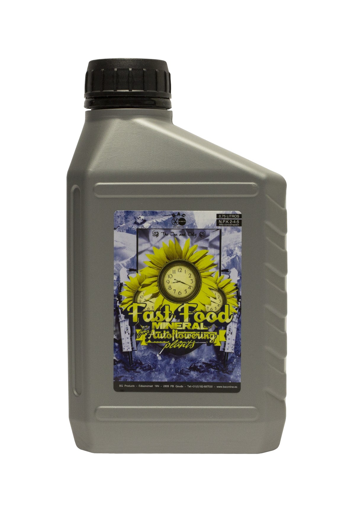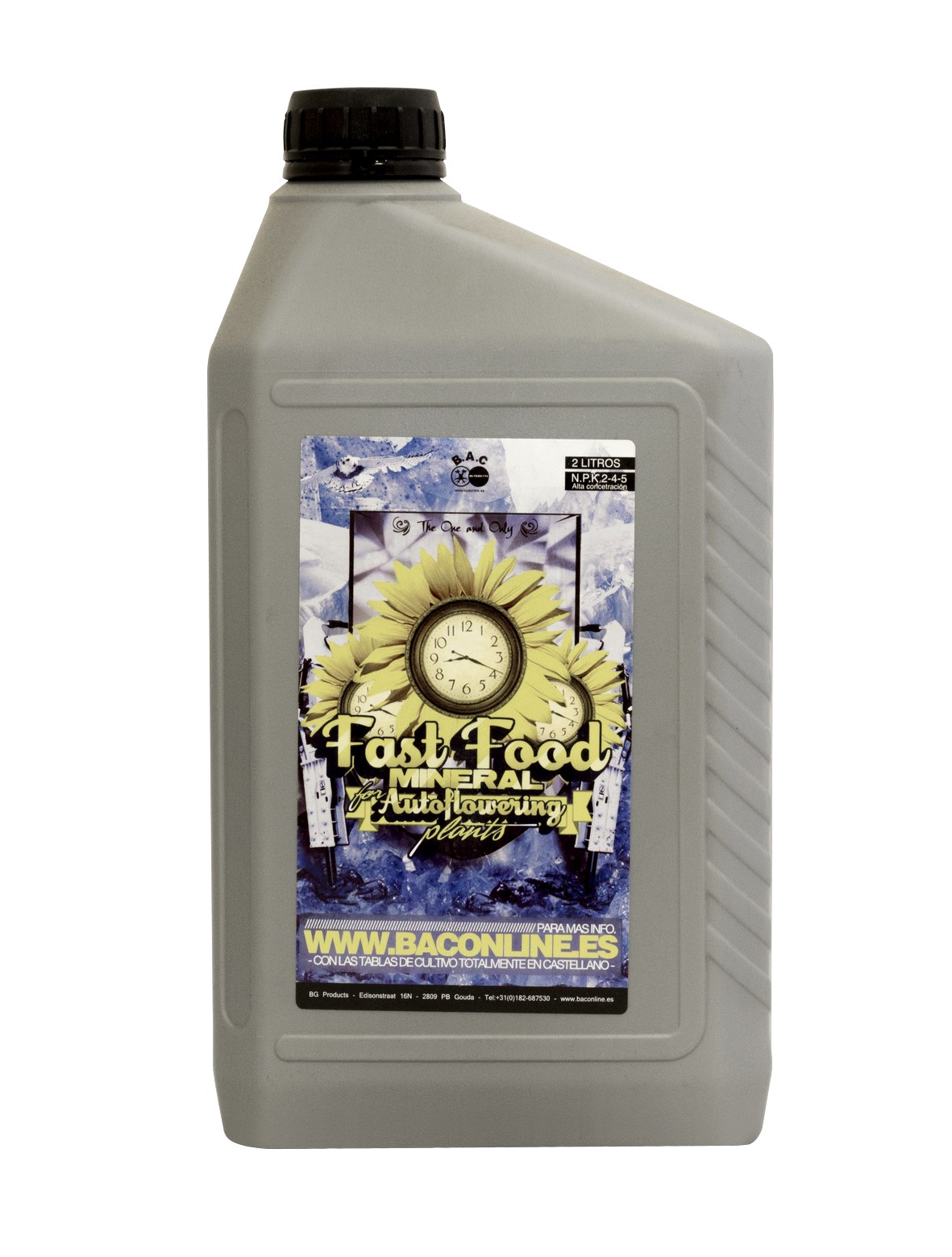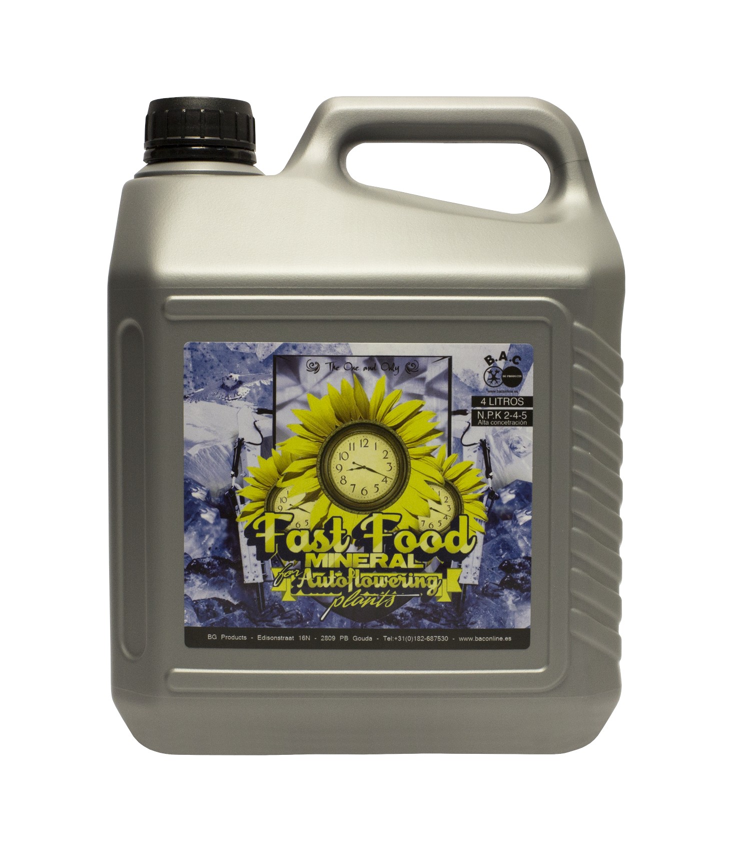 FAST FOOD MINERAL de B.A.C. es un fertilizante mineral diseñado para cultivos de plantas de floración rápida y para variedades sin fotoperíodo, cada vez más extendidos gracias a la alta radiación solar en España. Con una media aproximada de 300 días de sol al año, temperaturas suaves y un abonado adecuado, es posible obtener cosechas más abundantes y de mayor calidad.