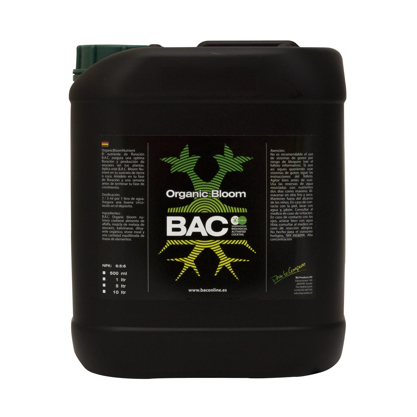 ORGANIC BLOOM de B.A.C. es un fertilizante 100% orgánico diseñado específicamente para cubrir las necesidades nutricionales durante la etapa de floración. Su formulación aporta la mezcla equilibrada de nutrientes que las plantas requieren en este periodo para un desarrollo óptimo.