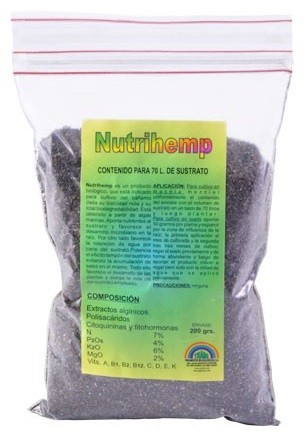 NUTRIHEMP es un abono orgánico de liberación lenta diseñado para incorporarse al sustrato al inicio del cultivo y proporcionar un suministro sostenido de nutrientes esenciales. Su formulación aporta nitrógeno, fósforo y potasio, además de secundarios como magnesio, elementos traza, ácidos húmicos y aminoácidos, cubriendo las necesidades nutritivas en las fases iniciales del ciclo vegetativo.